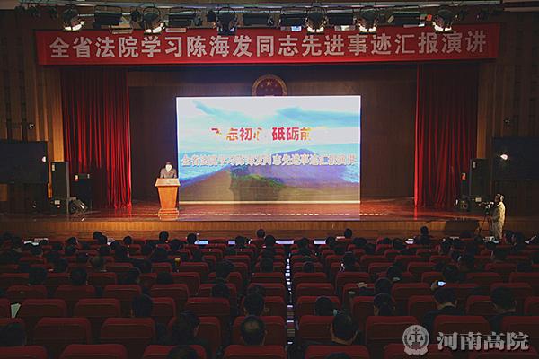 今天,河南省高级人民法院举行学习陈海发先进事迹汇报演讲会,共同纪念和学习陈海发。省高院党组书记、院长张立勇出席会议。省高院党组副书记、常务副院长田立文参加会议并讲话。在郑的院领导、厅级干部参加演讲会。 陈海发的先进事迹真实感人,可敬可学,为广大党员干部树立了新的标杆,为人民法院队伍建设增添了新的动力。演讲会上,大家观看了反映陈海发先进事迹的专题片《用信仰唱尽生命之歌》。来自全省法院的六名同志用质朴的语言、生动的事例和真挚的情感,深情讲述了陈海发的先进事迹,让现场听众再次感受到了陈海发的精神魅力,使大家的心灵受到了震撼,精神得到了洗礼。 受张立勇院长和党组委托,田立文就学习陈海发先进事迹,提出要求: 一要学习他信念坚定、对党忠诚的政治品格。全省法院广大干警要以陈海发为榜样,时刻牢记作为一名共产党员的职责使命,做党的人,听党的话,时刻跟党走,始终与党中央、省委保持高度一致,始终在省高院党组的坚强领导下开展工作,一切以组织为重、以大局为重,始终做到守纪律、讲规矩,永葆共产党员的先进性和纯洁性。 二要学习他开拓进取、勇于担当的职业追求。全省法院广大干警要以陈海发为榜样,紧紧围绕党和国家工作大局和法院重要工作部署,立足岗位,忠于职守,在难题面前敢闯敢试,在矛盾面前敢抓敢管,在风险面前敢作敢为,把全部心思和精力用在干事创业上。 三要学习他严谨负责、无私奉献的工作作风。全省法院广大干警要以陈海发为榜样,本着对司法事业极端负责的精神,把每一个工作岗位都当作奋斗的舞台,把每一项工作都当作奉献的机会,始终坚持最高标准、坚持最严要求,于细微之处见精神,在细节之间显水平。 四要学习他不怕困难、坚韧不屈的顽强意志。全省法院广大干警要以陈海发为榜样,大力发扬共产党员不畏艰难、不怕牺牲的大无畏精神,始终保持积极向上的心态,在平凡的岗位上勤勉工作、尽职尽责,生命不息、奋斗不止。