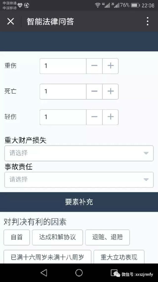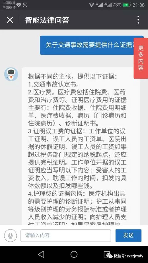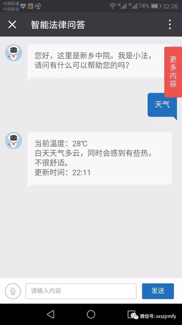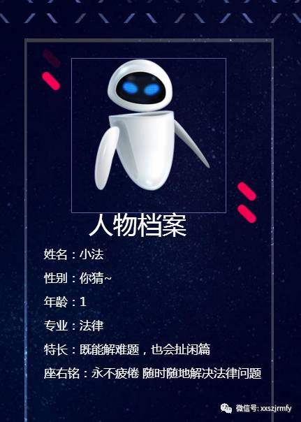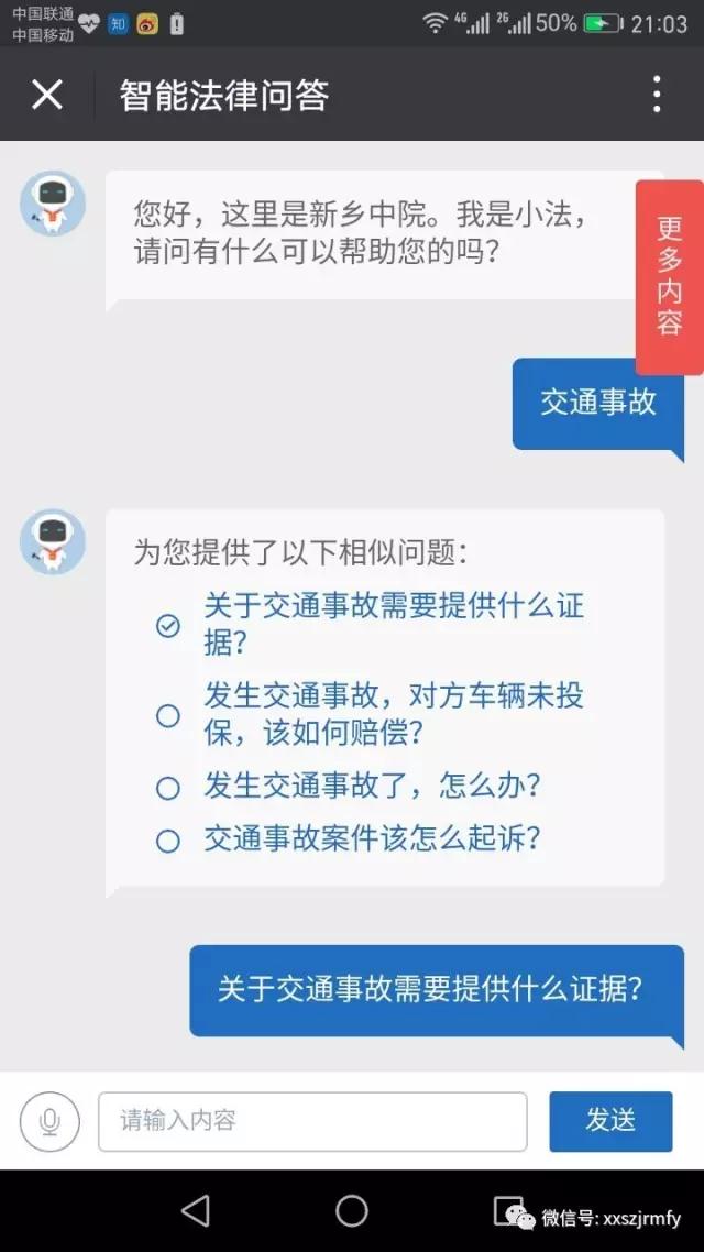 绝招一:法律问题 有问必答 有任何法律问题,直接通过语音或者文本输入关键词点击发送后,进入查询界面。根据自身需要选择相应项目查询即可。查询结果如图所示,一目了然。 PS:为了便于小法君识别问题,请输入关键词,关键词,关键词! 不要直接输入问题句子哟!也尽量不要一次输入多个关键词 ——毕竟,人家小法君只是个机器人嘛,太长的句子和信息会让它感到迷茫的~~~ 绝招二:类案要素指引 裁判预测参考 点击右上方“更多内容”,选择案由,并按提示填写要素式案件信息, 对于交通肇事、危险驾驶、盗窃、故意伤害、抢劫、抢夺等十余种常见罪名,以及离婚纠纷、劳动争议、民间借贷等常见民事案件,然后由小法君根据法律规定和司法判例,对裁判结果进行参考性的预判,也可以由当事人了解查询相似判例,让当事人在诉讼之前对裁判结果有一定的评估依据。 PS:司法案件都有一些独特的事实因素,所以,小法君的评估仅供参考,仅供参考、仅供参考哟! 绝招三:费用赔偿 轻松知晓 如上所述,点击右上角“更多内容”进入后,点击法律工具,然后选择费用计算器,按照要求填写基本信息,即可对诉讼费用、工伤赔偿、交通事故赔偿等常见费用和赔偿金额进行估算。 PS:如上所述,有关费用和赔偿,也是仅供参考、仅供参考、仅供参考!具体的费用和赔偿还要以法院实际裁判为准滴! 绝招四:百科天气 助手达人 作为一个爱学习的机器人,仅仅知道法律知识肯定是不够的。大到天文地理,中到时政人文、小到生活百科,再到娱乐新闻,贴心到天气贴士,小法都是样样门清呢。直接在对话框输入查询查询内容或者直接语音输入,就可以轻松了解更多信息啦。 绝招五:轻撩尬聊 唠嗑良伴 除了工作学习,小法君也是个爱唠嗑扯闲篇的话痨。虽然人类的语言仍在学习中,聊天思路经常跳跃的有点大,不过孤单寂寞的小伙伴儿反正也没人理,跟小法君轻轻松松聊会儿天,想来也是极好的呢。小法君作为爱岗敬业好陪聊,诚心欢迎各种调戏各种尬聊哟! 怎么样?这就是我们的新朋友法律学霸小法君啦! 所以,还等什么呢? 赶快关注新乡中院官方微信!小法君撩起来!