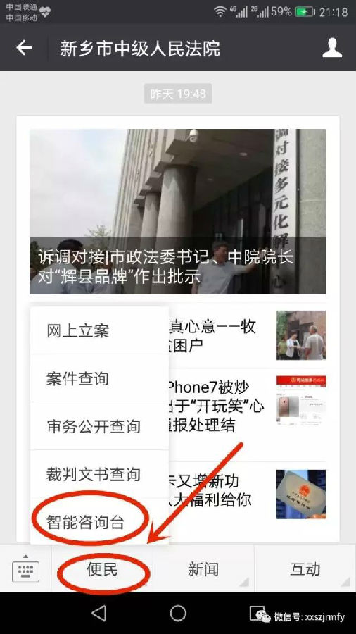 第一步:关注微信公众号:新乡市中级人民法院(微信号:xxszjrmfy)。