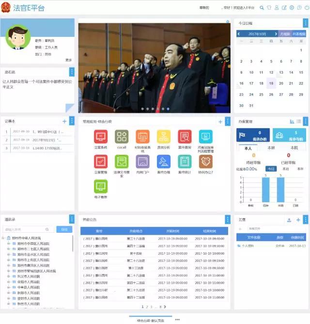 建立法官工作平台,配合“统一身份认证系统”实现与法院各应用系统的一键登录,干警在平台首页即可全面掌握通知公告、待办公文、办案管理、审委会上会申请等信息,同时系统内置通讯录、日程、消息中心、审批提醒等模块,为法官办公办案提供辅助支持。