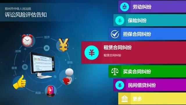 建立诉讼风险智能评估系统,通过大数据分析、法律知识图谱,智能化帮助当事人评估诉与非诉解决纠纷的差别,引导当事人选择更合适的纠纷解决办法,帮助当事人知晓起诉条件有哪些,可能存在哪些风险;提示当事人根据自己的具体诉求需要准备哪些证据材料,可能遇到哪些风险;实现重大风险即时告知,提出合理化建议。